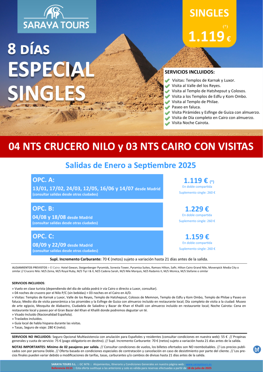 Especial Singles a Egipto 8 días Crucero y Cairo con Visitas Incluidas hasta Abril26. Desde 1159 €