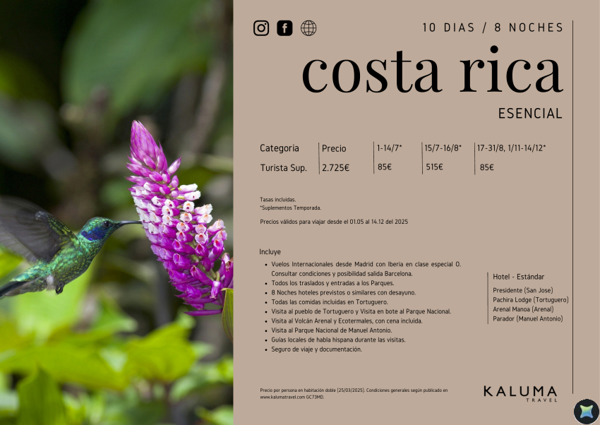 Costa Rica Esencial 8 noches - Salidas Diarias hasta Diciembre desde 2.810€