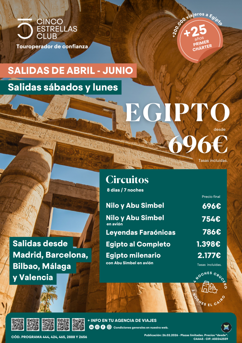 Egipto salidas abil-junio sábados y lunes desde 696€ Nilo y Abu Simbel 8ds/7ns sal.dsd Mad,Bcn,Bio,Agp,Vlc